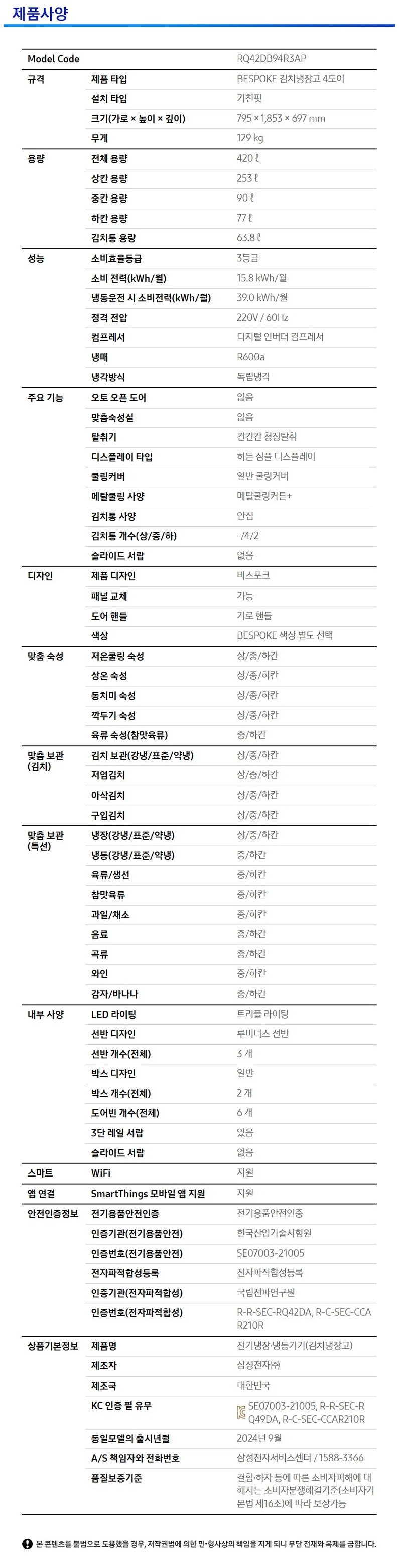 [주간특가] 삼성전자 비스포크 420L 스탠드형 4도어 냉장고 AI 김치플러스 키친핏 코타화이트