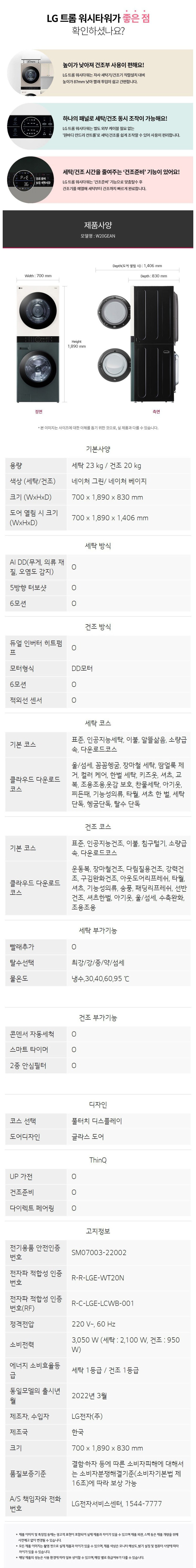[주간특가] (1등급) LG전자 트롬 오브제컬렉션 워시타워 세탁기 23kg + 건조기 20kg