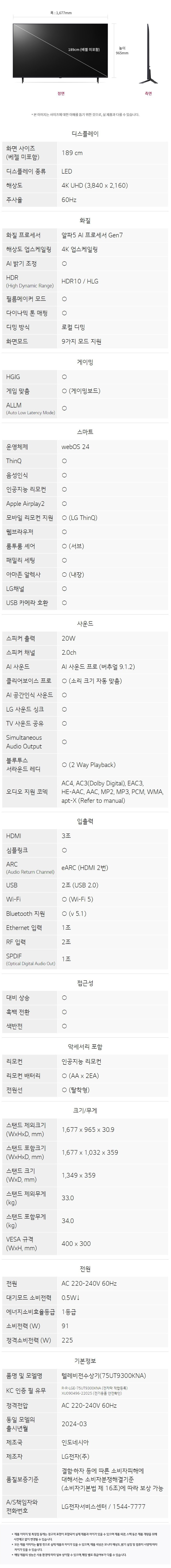 [주간특가] (1등급) LG전자 24년형 4K UHD LED TV 75인치